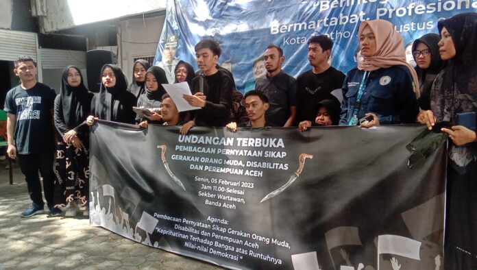 Analisaaceh.com, Banda Aceh | Gerakan Muda, Disabilitas dan Perempuan Aceh membaca Pembacaan Pernyataan sikap yang menyatakan prihatin terhadap nilai-nilai demokrasi menjelang pemilu 2024.