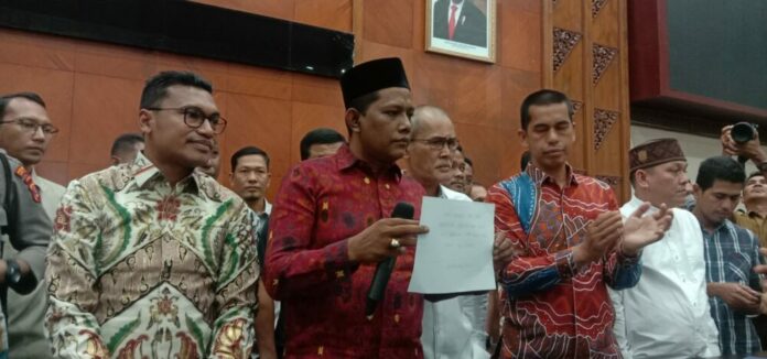 Analisaaceh.com, Banda Aceh | Ketua Dewan Perwakilan Rakyat Aceh (DPRA) Saiful Bahri menemui massa aksi dan menyetujui poin yang dituntut oleh mahasiswa terkait penurunan harga Bahan Bakar Minyak (BBM) di gedung utama DPRA pada Senin (5/9/2022).