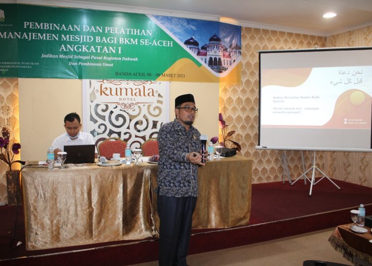 Hal tersebut disampaikan oleh Ketua Komisi VI DPRA, Tgk H Irawan Abdullah, S.Ag saat membuka acara sekaligus menjadi pemateri dalam kegiatan Pembinaan dan Pelatihan Manajemen Masjid bagi Badan Kemakmuran Masjid (BKM) Se Aceh yang dilakasanakan Dinas Syariat Islam Aceh di Keumala Hotel, Senin (08/3/2021).