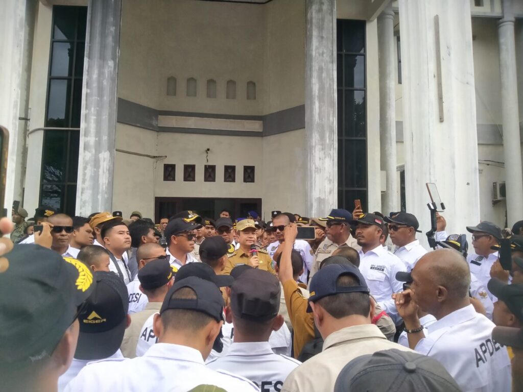 Pj Bupati Abdya, Sunawardi saat menjumpai aparatur desa dan keuchik di yang melakukan demo terkait pencairan dana ADG. Foto:Analisaaceh.com/Ahlul Zikri