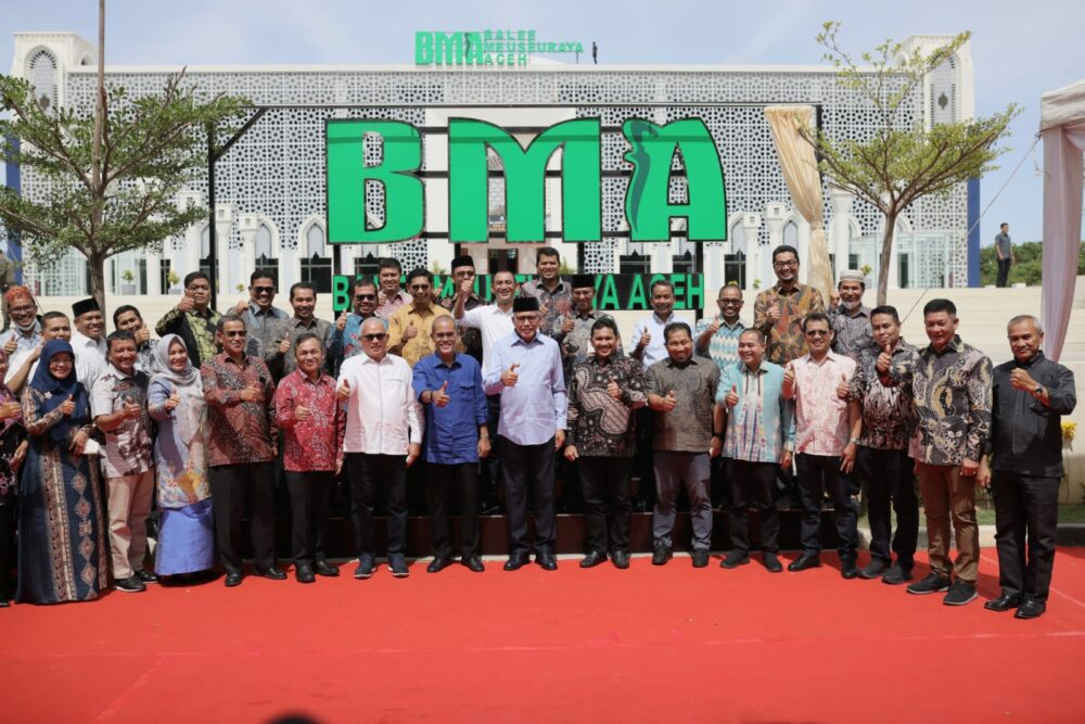 Gubernur Aceh, Nova Iriansyah, didampingi, Wakil Ketua DPRA, Dalimi, Sekda Aceh, Taqwallah, dan perwakilan Forkopimda Aceh serta seluruh Kepala SKPA, melakukan foto bersama usai meresmikan Balee Meuseraya Aceh (BMA) dan Balee Keurukon Inong Aceh (BKIA), di Banda Aceh, Sabtu, (11/6/2022).