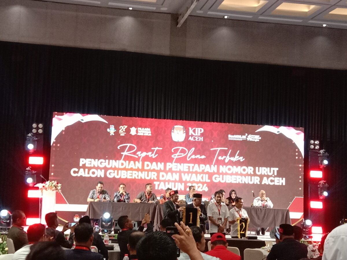 Analisaaceh.com, Banda Aceh | Komisi Independen Pemilihan (KIP) Aceh resmi menetapkan nomor urut pasangan calon Gubernur dan Wakil Gubernur Aceh yang akan bertarung dalam Pilkada serentak pada 27 November 2024.