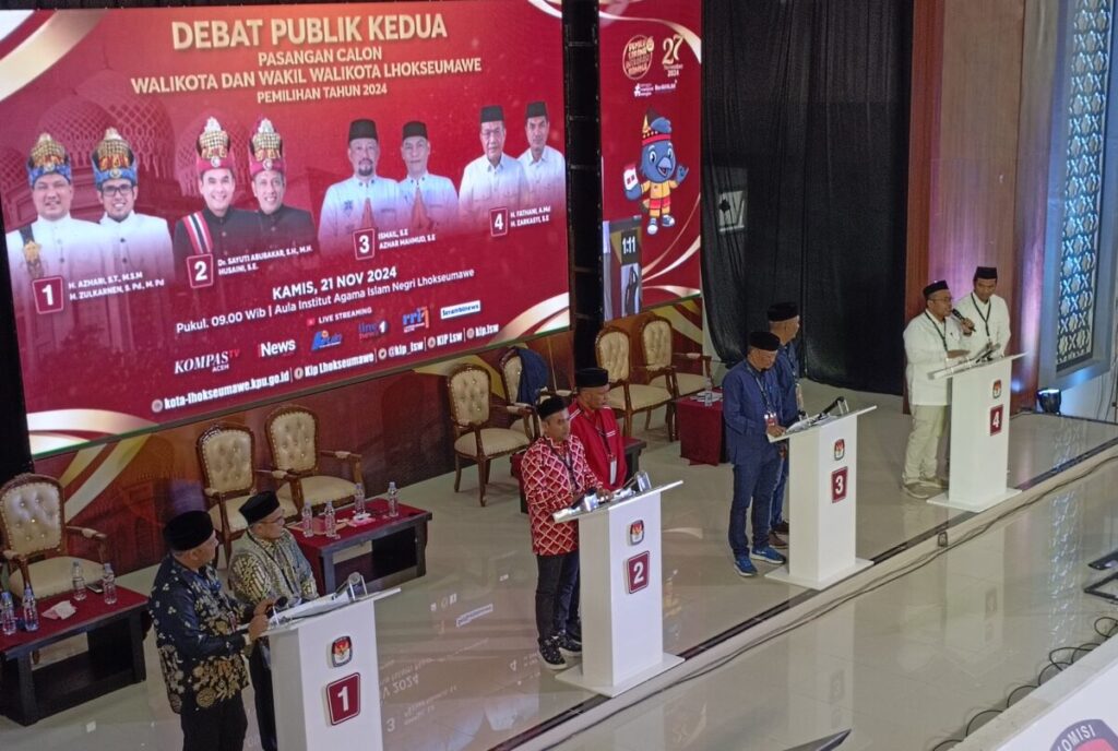 Analisaaceh.com, Lhokseumawe | Komisi Independen Pemilihan (KIP) Lhokseumawe sukses menyelenggarakan debat kedua calon Wali Kota dan Wakil Wali Kota pada Kamis, 21 November 2024. Debat yang digelar di Gedung Serbaguna IAIN Lhokseumawe ini mengangkat tema “Menuju Kota Lhokseumawe yang Bermartabat, Sehat, dan Bersyariat”. Dalam acara tersebut, empat pasangan calon memaparkan visi, misi, dan program unggulan mereka.