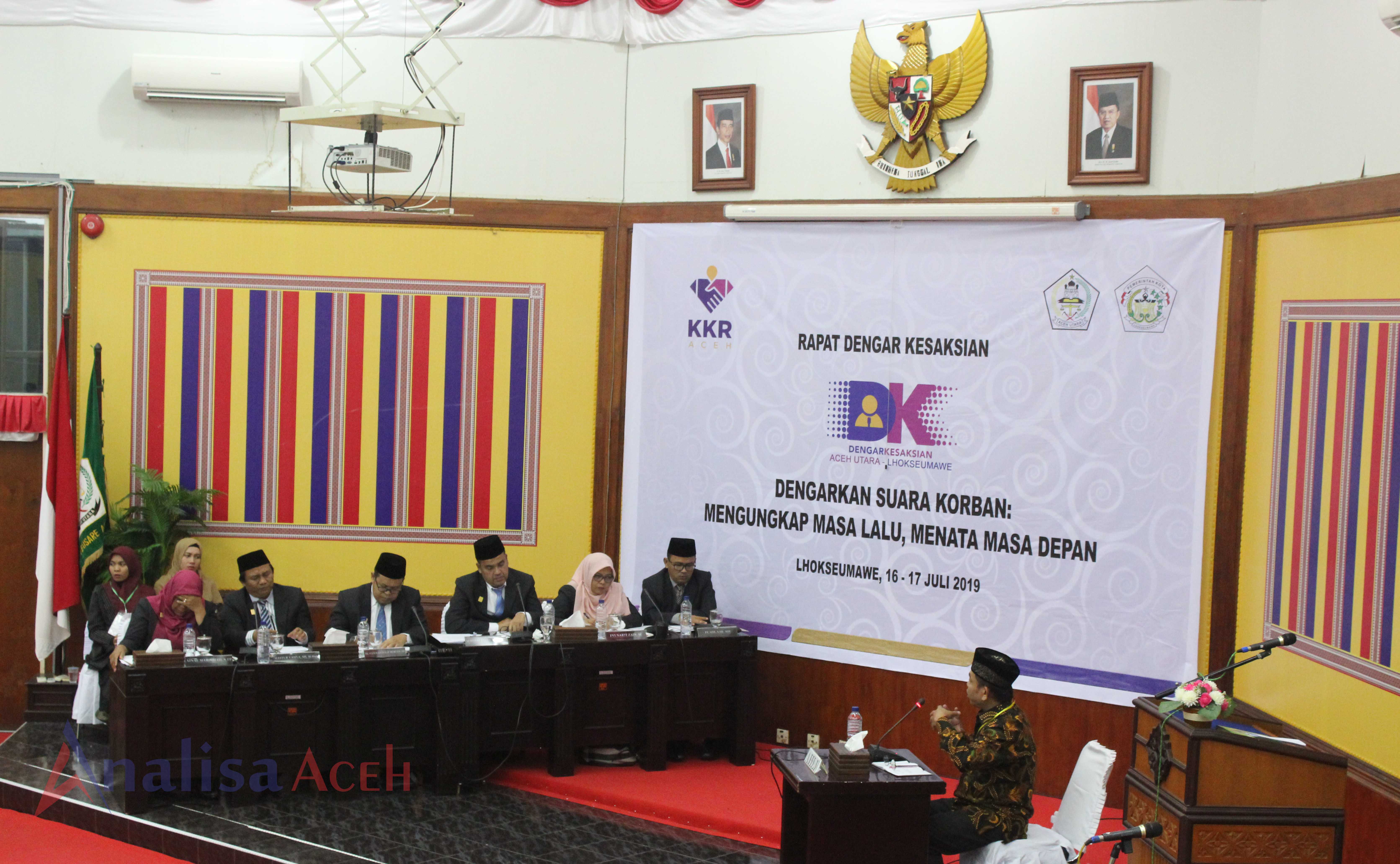 Komisoner Komisi Kebenaran dan Rekonsiliasi (KKR) Aceh saat mendengarkan pemaparan antropolog dalam Rapat Dengar Kesaksian (RDK) terhadap 17 korban konflik Aceh yang digelar pada 16-17 Juli 2019 di Gedung DPRK Aceh Utara di Lhokseumawe. (AA/Dayat)