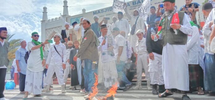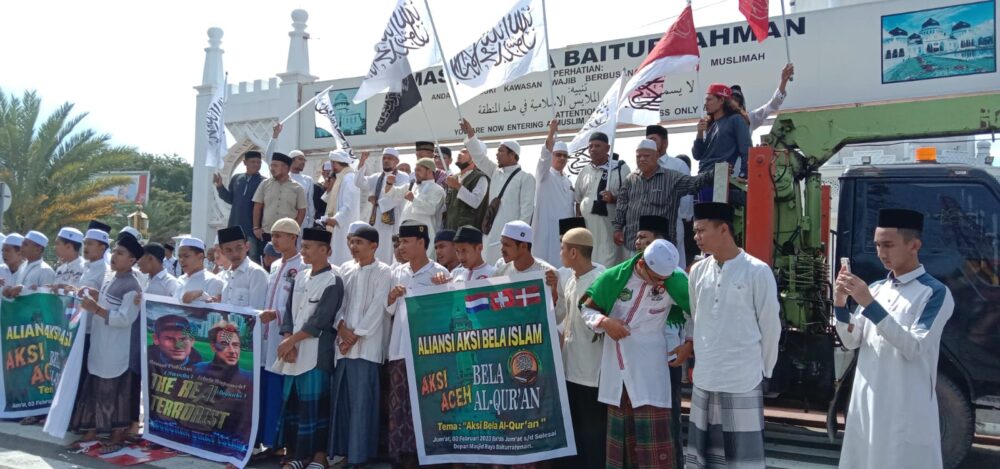 Analisaaceh.com, Banda Aceh | Puluhan massa yang tergabung dalam Aceh Bela Islam (ABI) menggelar aksi unjuk rasa pada Jum’at (3/2/2023) di depan Mesjid Raya Baiturrahman, Banda Aceh.