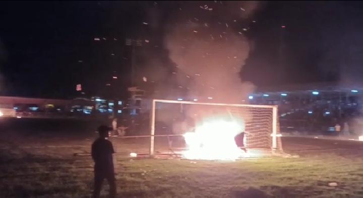 Amatan di lokasi, kebakaran terlihat di sejumlah fasilitas stadion seperti jaring gawang, papan iklan sponsor, spanduk, bench pemain dan sejumlah fasilitas lainnya.