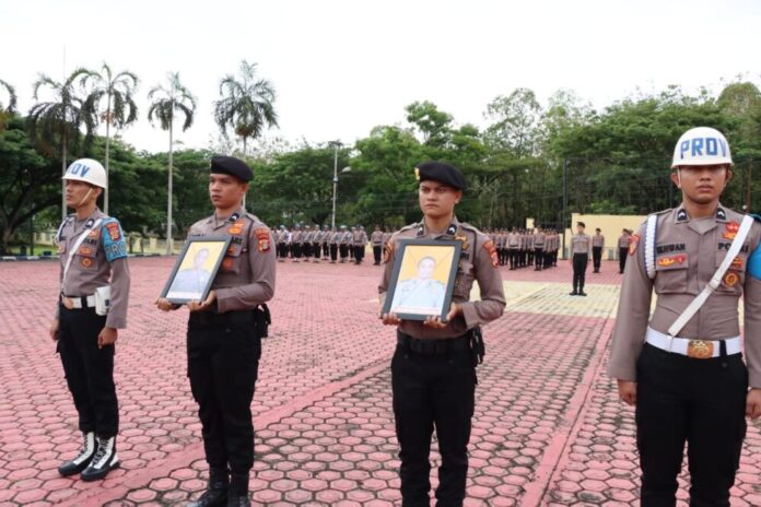Kapolres Aceh Besar melakukan PTDH dengan pencoretan foto Brigpol FP dan Brigpol RS karena tidak hadir saat upacara PTDH.