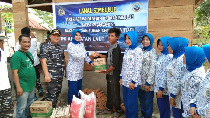 Analisaaceh.com, SIMEULUE | Dalam rangka menyambut HUT Angkatan Laut ke 74, Lanal Simeulue bekerja sama dengan Kabar Simeulue group (KBSG) melakukan penyerahan bantuan sembako dan gotong royong bersama di pembangunan rumah Alsadri anak yatim piatu di Desa Bunon, Kecamatan Teupah Barat, Sabtu (07/09/2019).