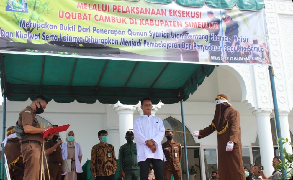 Analisaaceh.com, Simeulue | Sebanyak enam pelaku pelanggar qanun syariat Islam di Simeulue menjalani hukuman cambuk di halaman Masjid Agung Kota Sinabang, Jum’at (24/7/2020).