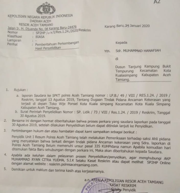 Adapun dalam surat dimaksud, pada poin 1 rujukan disebutkan, laporan saudara ke SPKT Polres Aceh Tamiang nomor LP.B/49/VIII/RES.124/2019/Reskrim tanggal 13 Agustus 2019, Tentang Dugaan Tindak Pidana Ancaman Kekerasan yang terjadi di depan toko Wije Ponsel Kota Kuala Simpang, Kecamatan Kota Kuala Simpang, Kabupaten Aceh Tamiang dan surat perintah penyelidikan Nomor SP.Lidik/73/VIII/Res 1.24/2019/Reskrim, tanggal 30 Agustus 2019.