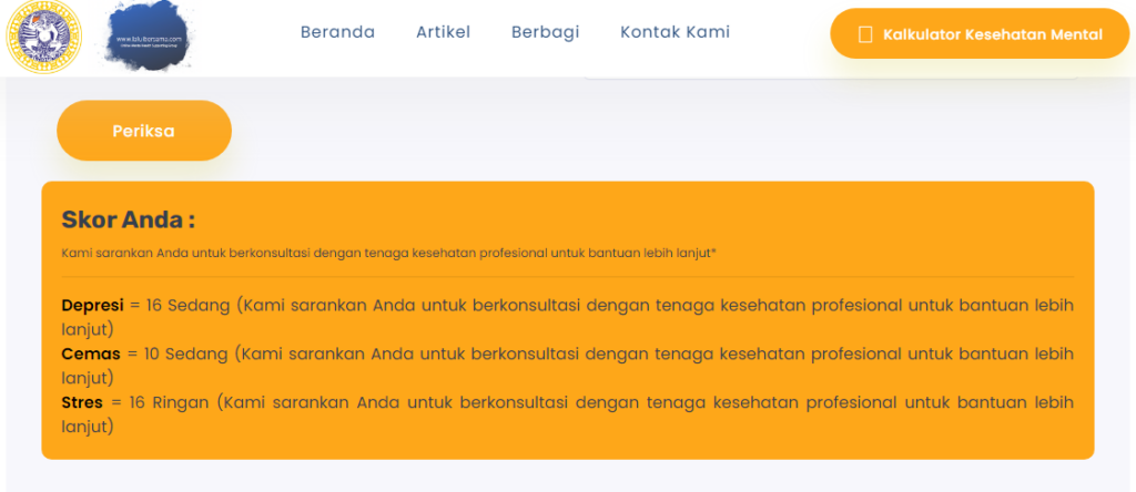 Apakah anda merasa sedang depresi, stres, pusing dan sebagainya?. Maka anda dapat mengecek kondisi mental melalui Kalkulator kesehatan mental melalui link yang telah disediakan.