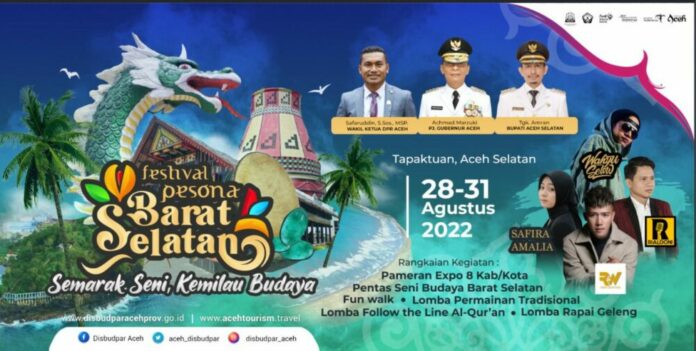 Analisaaceh.com, Banda Aceh | Dinas Kebudayaan dan Pariwisata (Disbudpar) Aceh bakal menghelat Festival Pesona Barat Selatan 2022 pada akhir pekan ini, 27-28 Agustus 2022 di Tapak Tuan, Kabupaten Aceh Selatan.