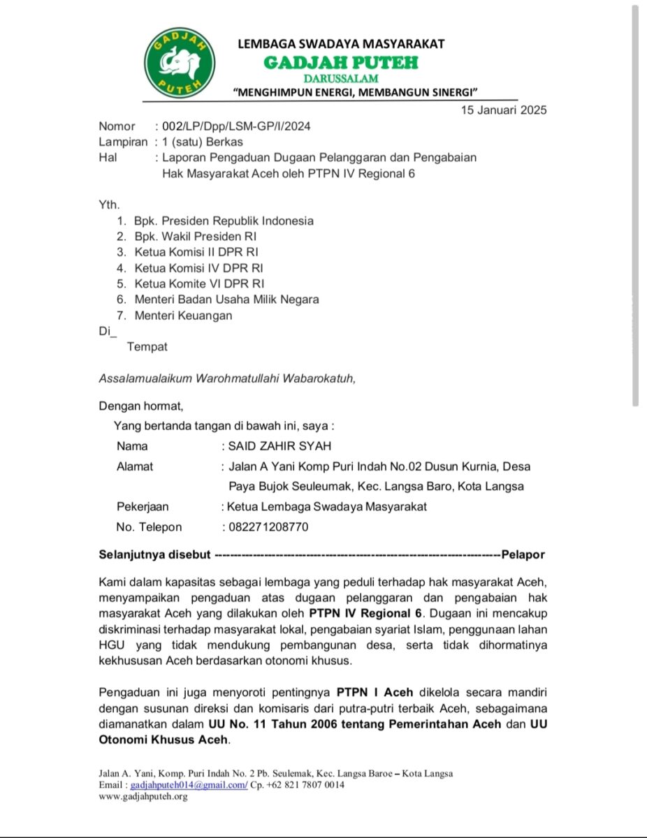 Analisaaceh.com, Langsa | Lembaga Swadaya Masyarakat (LSM) Gadjah Puteh melaporkan Perkebunan Nusantara (PTPN) IV Regional 6 Kerja Sama Operasional (KSO) atas dugaan pelanggaran terhadap hak masyarakat Aceh.