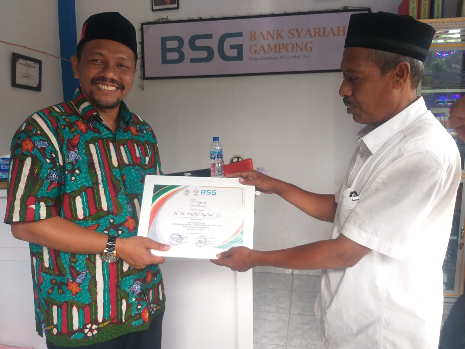 Dalam Kunjungannya Senator DPD RI asal Aceh M Fadhil Rahmi, Lc memberikan apresiasi kepada Bank Syariah Gampong (BSG) Riseh Tunong, Kecamatan Sawang, Kabupaten Aceh Utara.