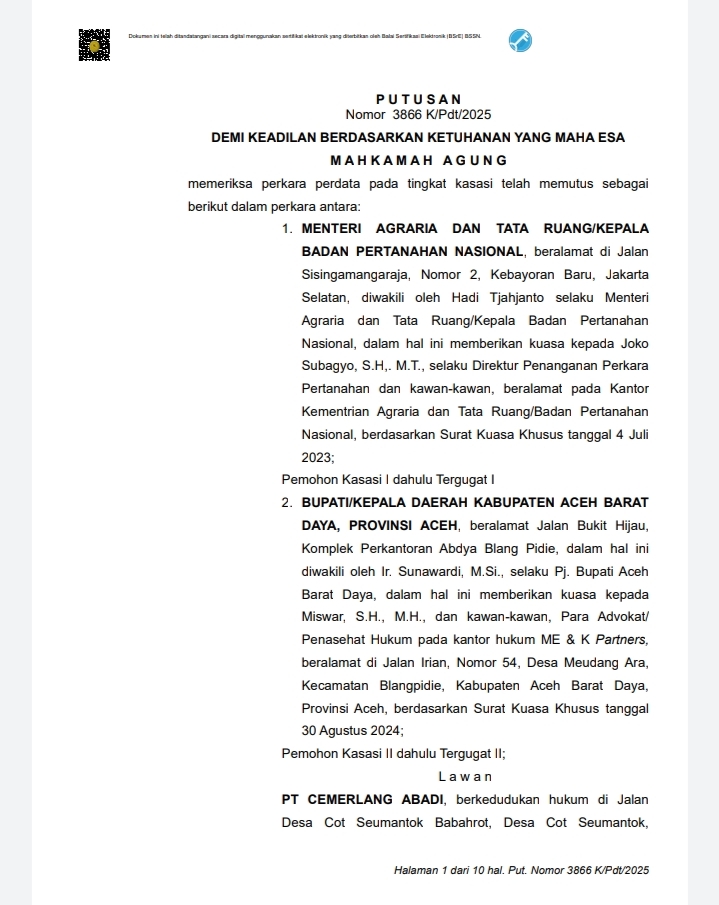 Mahkamah Agung (MA) melalui putusan Nomor 3866 K/Pdt/2025 yang ditetapkan pada 15 September 2025, mengabulkan permohonan kasasi yang diajukan oleh Bupati Abdya. Putusan tersebut sekaligus membatalkan putusan Pengadilan Tinggi DKI Jakarta Nomor 89/Pdt/2025/PT DKI dan putusan Pengadilan Negeri Jakarta Selatan Nomor 534/Pdt.G/2023/PN Jkt.Sel.