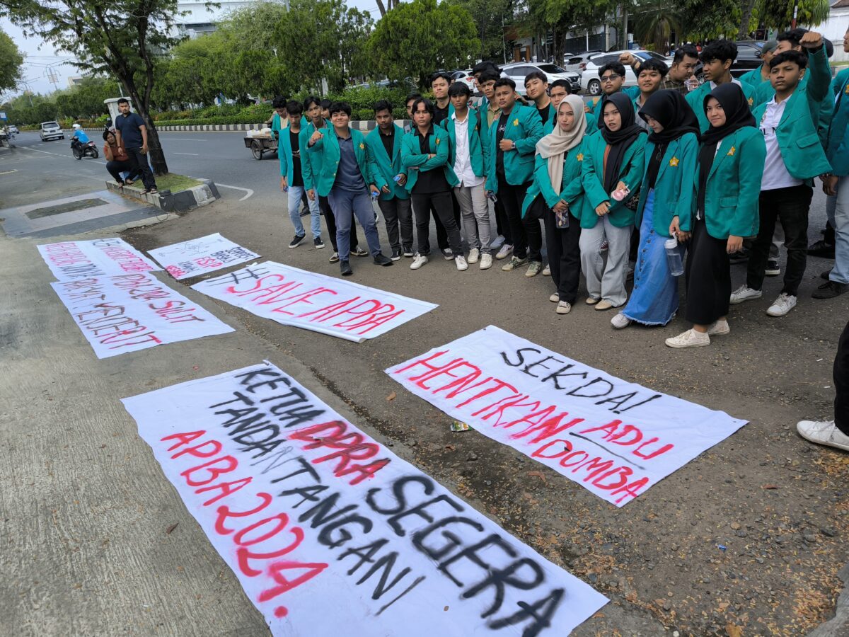 Analisaaceh.com, Banda Aceh | Mahasiswa FISIP Universitas Syiah Kuala (USK) melakukan aksi demo terkait pengesahan Anggaran Pendapatan Belanja (APBA) Aceh di depan Dewan Perwakilan Rakyat Aceh (DPRA) Jum’at (8/3/2024).