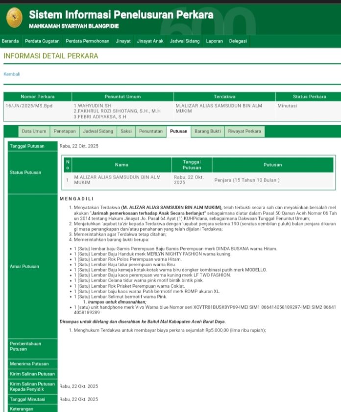 Putusan vonis 15 tahun sepuluh bulan penjara terhadap M Alizar diketahui Analisaaceh.com, melalui Sistem Informasi Penelusuran Perkara (SIPP) MS Blangpidie, Sabtu (31/10/2025).