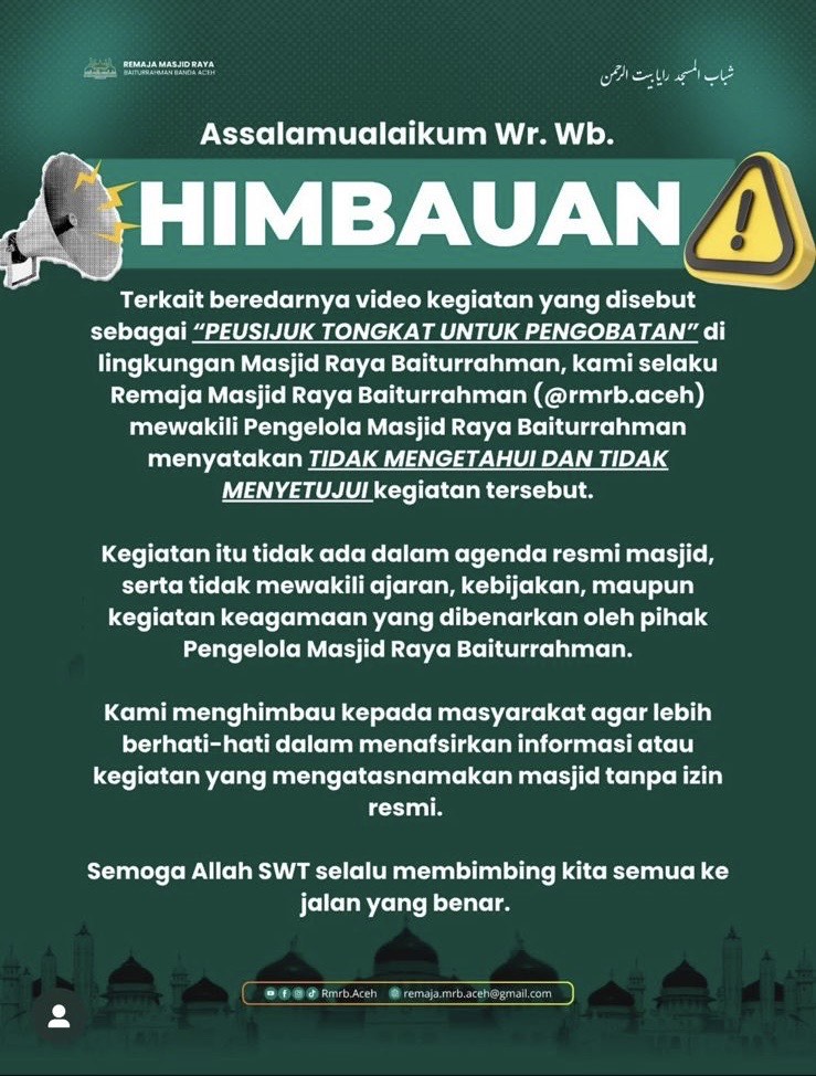 Menanggapi hal itu, Remaja Masjid Raya Baiturrahman (RMRB) Banda Aceh memberikan klarifikasi melalui akun Instagram resminya, @rmrb.aceh. Dalam unggahan tersebut, RMRB menegaskan bahwa kegiatan “Peusijuk Tongkat untuk Pengobatan” tidak pernah menjadi bagian dari agenda resmi Masjid Raya Baiturrahman.