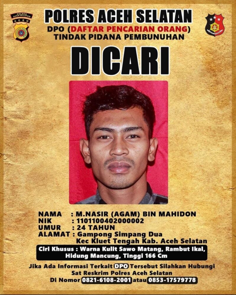 Analisaaceh.com, Tapaktuan | M. Nasir (Agam) Bin Mahidon (24) warga Gampong Simpang Dua, Kecamatan Kluet Tengah, Kabupaten Aceh Selatan masuk dalam Daftar Pencarian Orang (DPO) Polres Aceh Selatan.
