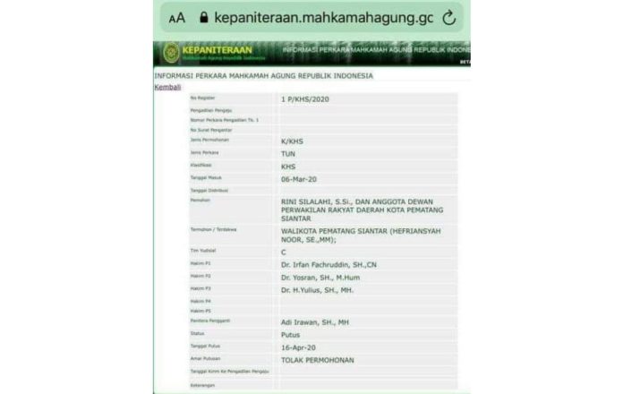 Analisaaceh.com, Medan | Sejumlah masyarakat Pematangsiantar, Sumatera Utara kembali tersenyum karena Mahkamah Agung (MA) telah memutuskan untuk menolak usulan pemakzulan Walikota Pematangsiantar H. Hefriansyah Noor, SE.,MM yang diajukan DPRD setempat.