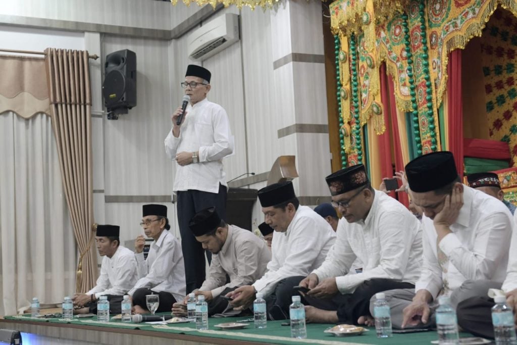 Ustadz Masrul Aidi memimpin tahlil Untuk Almarhumah Hj. Emmy Soekarni Binti Matsari Ibunda dari Istri Plt. Gubernur Aceh, di Aula Rumah Dinas Wakil Gubernur Aceh, Banda Aceh, (25/2/2020)