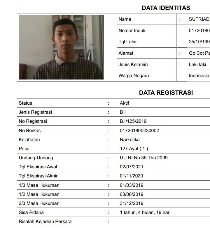 Berdasarkan data yang diperoleh dari Rutan Lhoksukon, Sufriadi merupakan napi kasus narkotika dengan masa hukuman 2 tahun 6 bulan. Almarhum mulai ditahan di Rutan Lhoksukon sejak tanggal 5 Mei 2018 atau sisa tahanan 1 tahun 4 bulan 19 hari. Sementara ²/3 masa tahanan almarhum yakni pada 31 Desember 2019. (Hidayat)