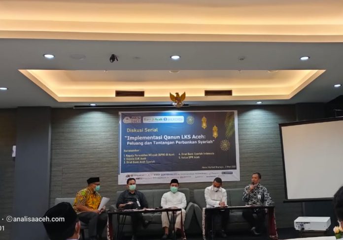Acara diskusi mengusung tema, Implementasi Qanun LKS Aceh, peluang dan tantangan perbankan syariah tersebut, dimoderatori Dr. Hendra Syahputra, Dosen Fakultas Ekonomi dan Bisnis UIN Ar Raniry yang turut dihadiri Ketua PWI Aceh, Tarmilin Usman dan Kanwil DJP Aceh, Imanul Hakim.