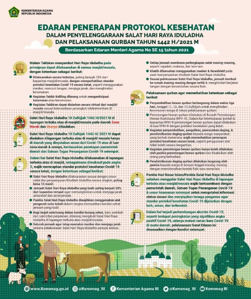 “Untuk memberikan rasa aman kepada umat Islam di tengah pandemi Covid-19 yang belum terkendali dan munculnya varian baru, perlu dilakukan penerapan protokol kesehatan secara ketat dalam penyelenggaraan Shalat Idul Adha dan pelaksanaan kurban 1442 H,” ujar Menag, Yaqut Cholil Qoumas di Jakarta, Rabu (23/6/2021).