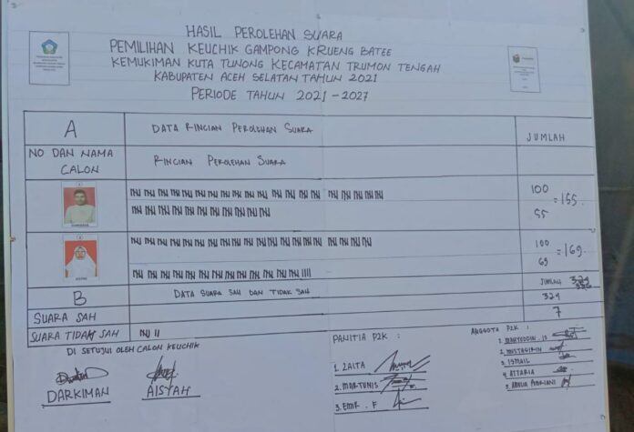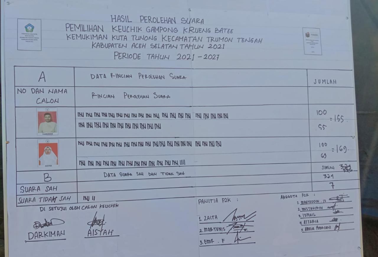 Wakil Ketua Panitia Pemilihan Keuchik (P2K), Martunis mengatakan, Aisyah memperoleh suara 169, sementara satu calon lainnya yakni Darsiman hanya memperoleh 155 suara.