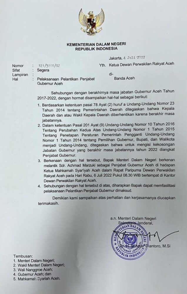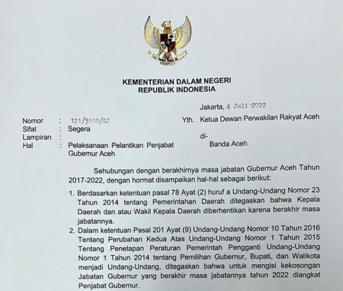 Hal tersebut berdasarkan surat Mendagri Nomor 121/3808/SJ tanggal 4 Juli 2022 yang ditujukan kepada DPR Aceh.