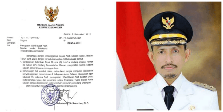 ANALISAACEH.COM, Banda Aceh | Kementerian Dalam Negeri (Kemendagri) menugaskan Gubernur Aceh untuk menunjuk Wakil Bupati Aceh Selatan, Tgk Amran sebagai Pelaksana Tugas (Plt) Bupati Aceh Selatan.