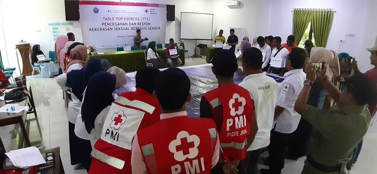 Analisaaceh.com, Pidie Jaya | PMI Pidie Jaya Lakukan Pelatihan Table Top Exercise (TTX) dalam Pencegahan dan Respon Kekerasan Seksual Berbasis Gender, dalam membangun kekuatan jaringan penanganan kasus pelecehan dan kekerasan anak dan Perempuan Kabupaten Pidie Jaya di Wima Ananda, Senin, 23/12/2019.