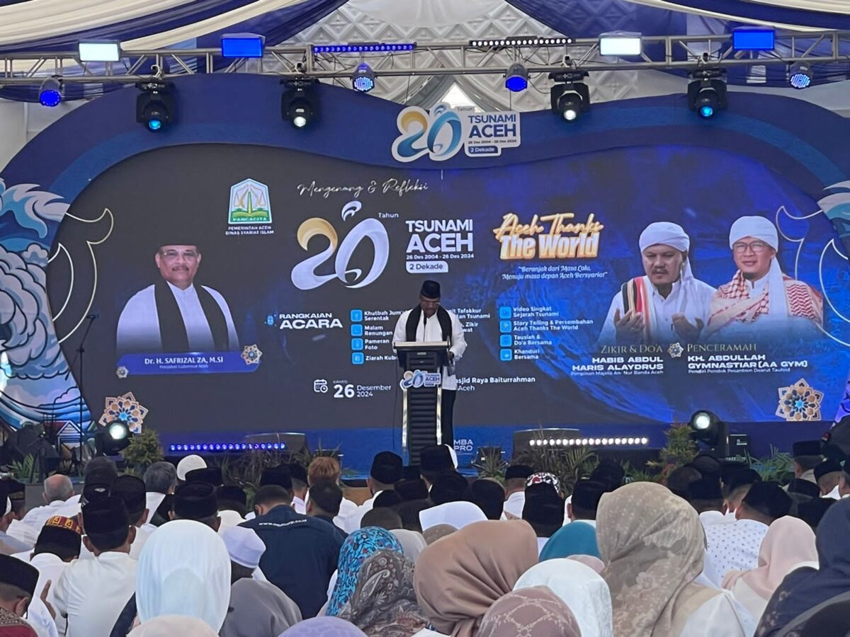 “Lebih dari 60 negara, ratusan organisasi internasional, dan ribuan relawan dari berbagai penjuru dunia datang ke Aceh, membawa bantuan, harapan, dan semangat untuk bangkit kembali. Kita menyaksikan bagaimana dunia bersatu untuk Aceh. Kita menyaksikan bagaimana ribuan relawan internasional bekerja tanpa kenal lelah,” paparnya.
