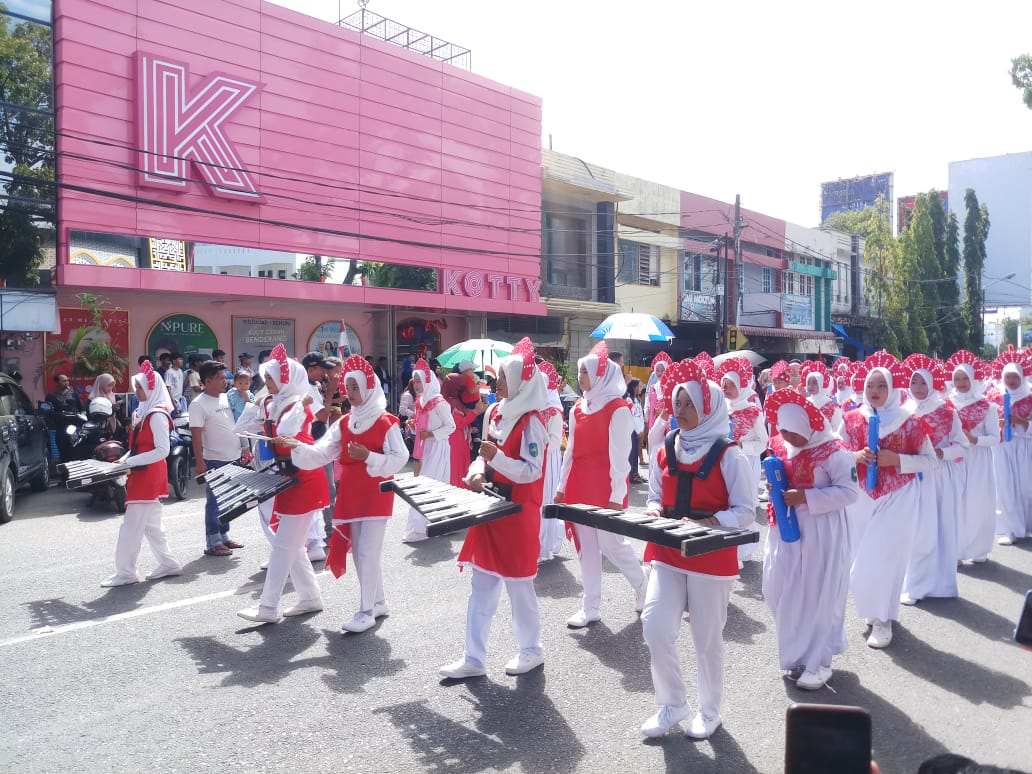 Analisaaceh.com, Banda Aceh | Ratusan pelajar di Kota Banda Aceh mengikuti pawai dalam rangka memeriahkan Hari Ulang Tahun (HUT) RI yang ke 77 pada Kamis (18/8/2022).
