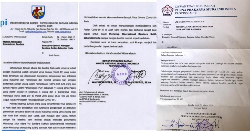 Hal senada juga disampaikan oleh DPD Purna Prakarya Muda Indonesia (PPMI) Provinsi Aceh yang turut menyurati Executive General Manager Bandara SIM pada 31 Maret 2020.