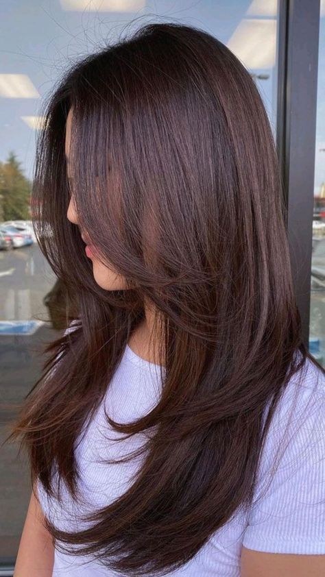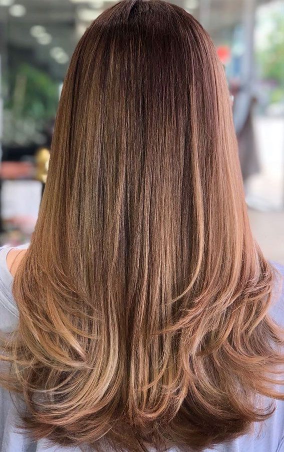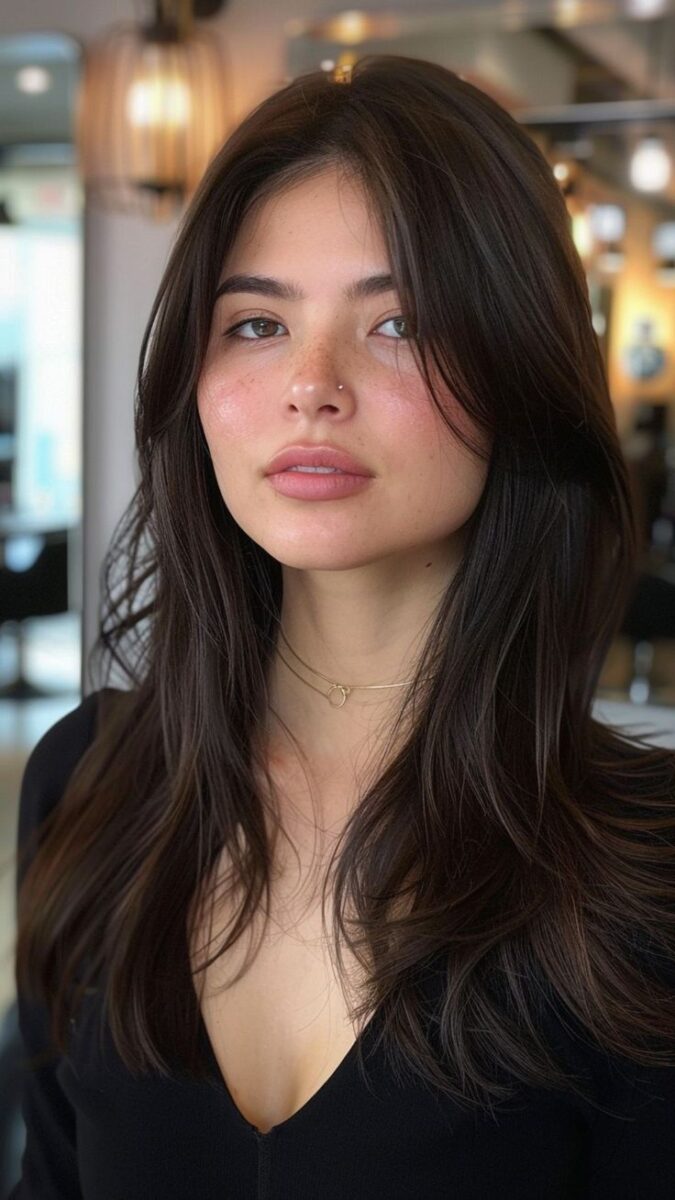 Tambahkan poni tipis atau curtain bangs untuk kesan modern. Long layered cut juga serasi dengan warna gradasi seperti balayage atau ombre.