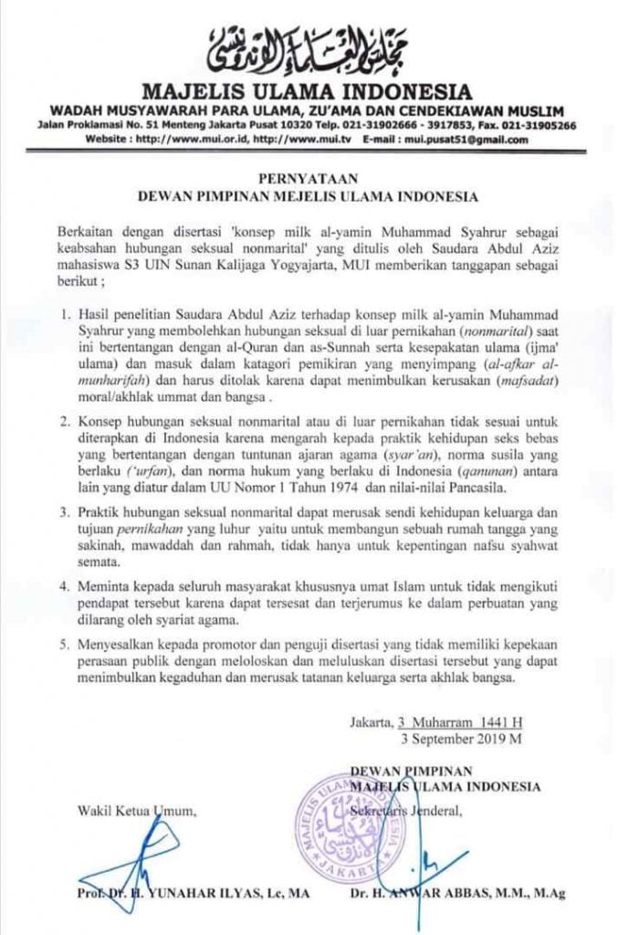 Berkaitan dengan disertasi ‘konsep milk al-yamin Muhammad Syahrur sebagai keabsahan hubungan seksual nonmarital’ yang ditulis oleh saudara Abdul Aziz mahasiswa S3 UIN Sunan Kalijaga Yogyajarta, MUI memberikan tanggapan sebagai berikut: