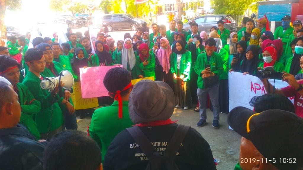 Sementara persidangan berlangsung, di luar gedung pengadilan, puluhan mahasiswa terus menggelar aksi damai dan orasi secara bergantian.