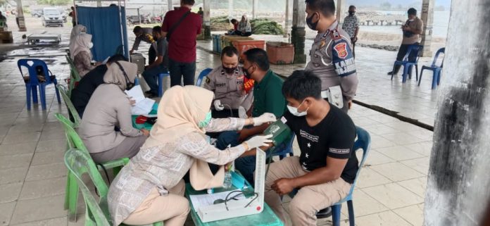 Kapolres Abdya, AKBP Muhammad Nasution, SIK saat meninjau proses jalannya vaksinasi turut memberikan apresiasi terhadap para warga terutama nelayan dan pedagang ikan yang antusias melakukan vaksin.