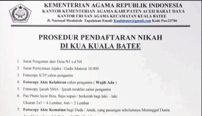 Kepala KUA Kecamatan Kuala Batee, Abdul Azi Jabbar membenarkan bahwa pihaknya mengeluarkan kebijakan tersebut, dan aturan ini merupakan bentuk tertib administrasi dan berlaku tidak hanya di Kecamatan Kuala Batee, akan tetapi juga untuk semua warga Abdya, bahkan juga berlaku secara nasional.