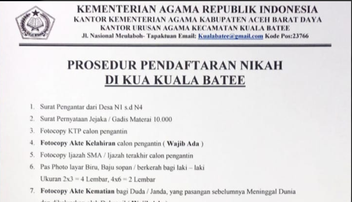 Khusus bagi duda dan janda yang pasangannya meninggal dunia, wajib melampirkan fotocopy akte kematian yang dikeluarkan oleh Dinas Kependudukan Dan Pencatatan Sipil (Dukcapil), melengkapi pas photo layar biru, baju sopan berkerah bagi laki -laki, dengan ukuran 2×3 4 lembar, dan 4×0 2 lembar, untuk masing-masing calon.