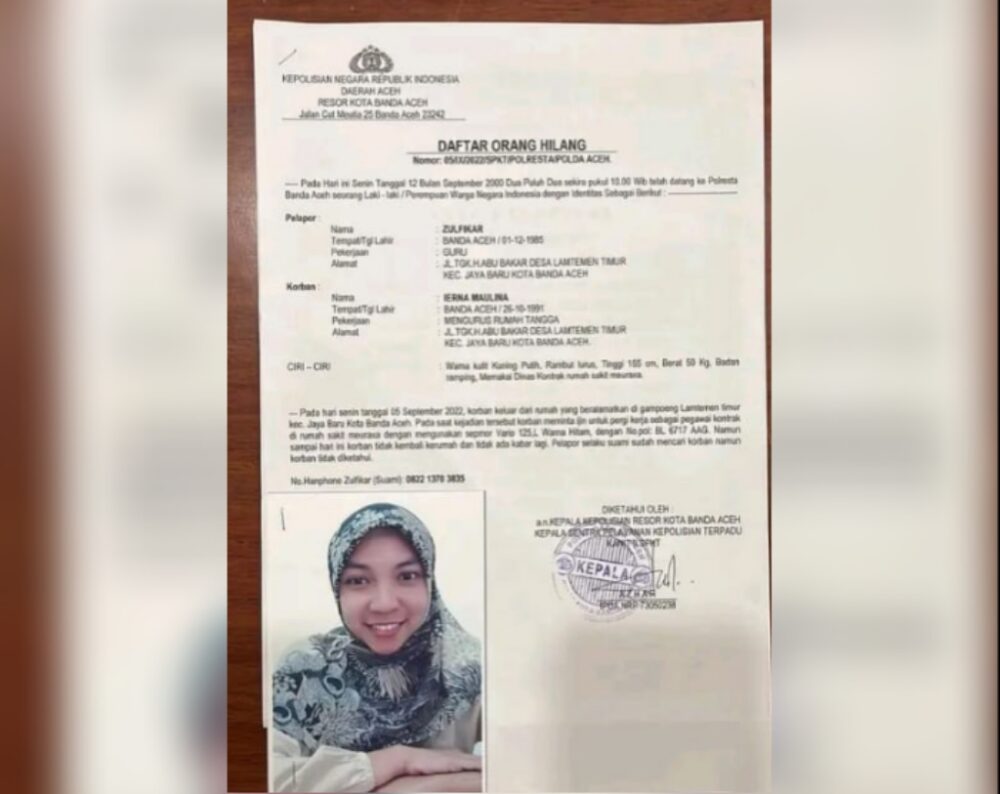 Analisaaceh.com, Banda Aceh | Ierna Maulina (31), seorang ibu rumah tangga (IRT) warga Gampong Lamtemen Timur, Kecamatan Jaya Baru Kota Banda Aceh dilaporkan hilang sejak Senin 5 September 2022 lalu.