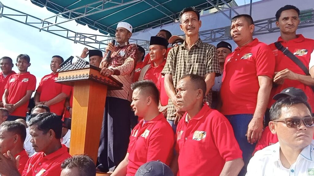 Ketua KPA 013 Wilayah Blangpidie, H. Abdurahman Ubit saat berorasi dalam acara Deklarasi Pasangan Safaruddin-Zaman Akli sebagai Bacalon Bupati dan Wakil Bupati Abdya yang berlangsung di Lapangan Persada, Gampong Keude Siblah, Kecamatan Blangpidie, Kabupaten setempat, Kamis (29/8/2024). Foto:Analisaaceh.com/Ahlul Zikri