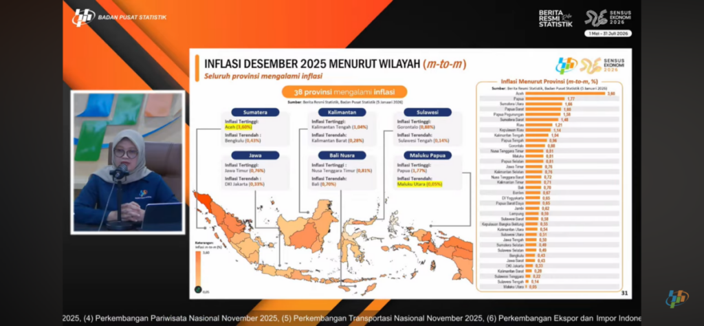 Secara nasional, BPS mencatat seluruh 38 provinsi di Indonesia mengalami inflasi pada Desember 2025. Untuk wilayah Sumatera, Aceh menjadi provinsi dengan inflasi tertinggi, sementara inflasi terendah tercatat di Bengkulu sebesar 0,43 persen.