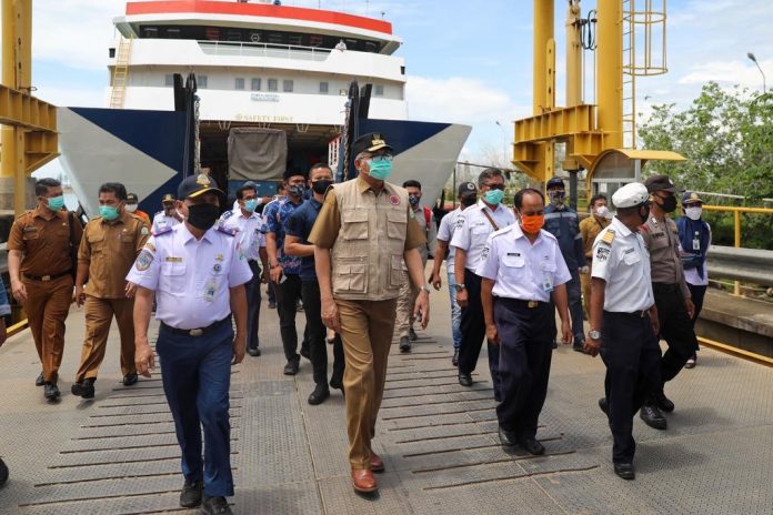 Analisaaceh.com, Banda Aceh | Pelaksana Tugas Gubernur Aceh, Nova Iriansyah, meninjau proses pengiriman logistik ke Sabang di Pelabuhan Penyeberangan Ulee Lheue, Banda Aceh, Selasa (12/5/2020), siang.