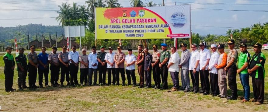 Analisaaceh.com, Pidie Jaya | Polres Pidie Jaya bersama Pemerintah Kabupaten dan diikuti berbagai unsur masyarakat gelar apel siaga bencana di lapangan persiapan Polres Pidie Jaya, Rabu (04/03/2020).