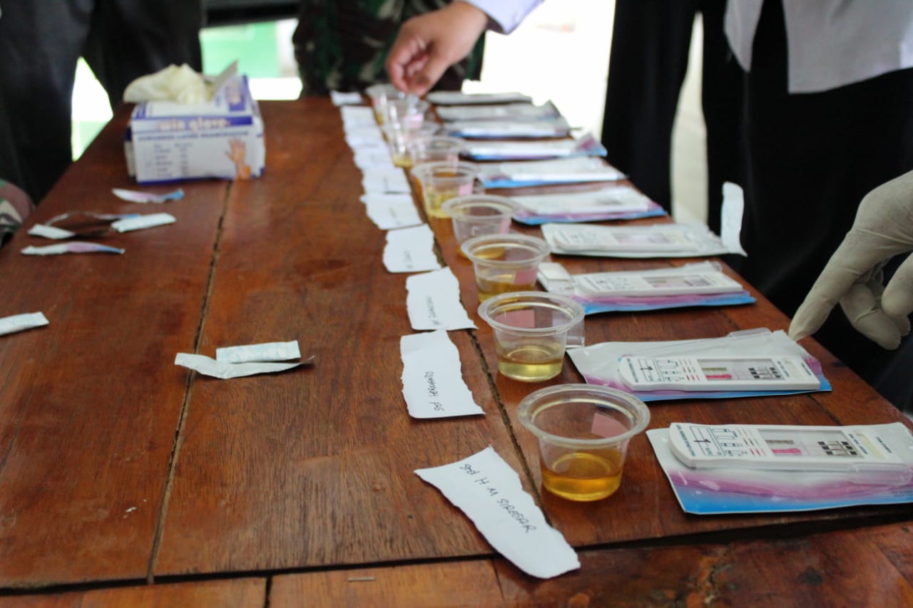 Dengan kawalan ketat provost dan tim Intel, satu persatu para prajurit memberikan sample urinenya kepada petugas lengkap dengan label nama masing-masing.