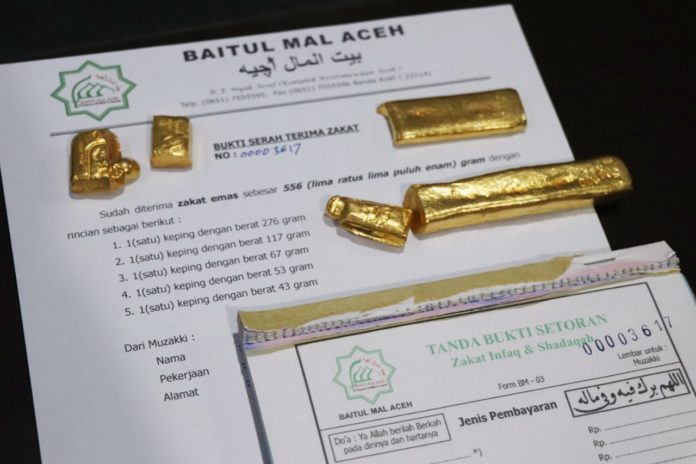 Analisaaceh.com, Banda Aceh | Seorang muzakki yang tidak mau disebutkan namanya menunaikan zakatnya melalui Baitul Mal Aceh. Zakat tersebut ia tunaikan dalam bentuk emas dengan ukuran berat setengah kilogram lebih atau tepatnya 556 gram.
