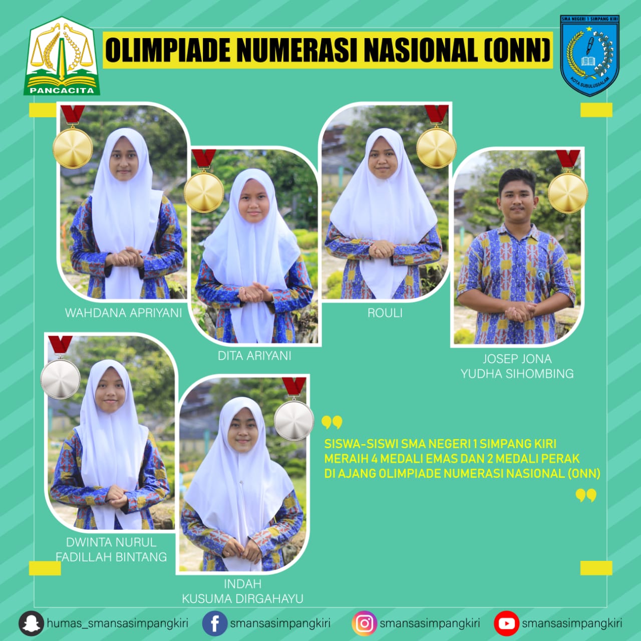 Analisaaceh.com, Banda Aceh | Pelajar SMAN 1 Simpang Kiri, Kota Subulussalam mendominasi perolehan medali pada ajang Olimpiade Numerasi Nasional (ONN) tahun 2020.