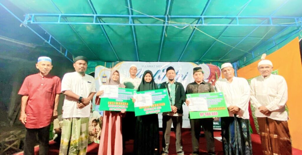 Aparatur Pemerintah Gampong Babahlung, Kecamatan Blangpidie, Abdya menyerahkan penghargaan kepada penghafal Al-Quran dan Tilawah Qur'an. Foto : Ist